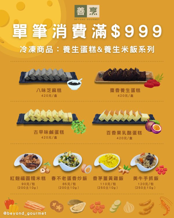 購買「養生蛋糕」或「養生米飯系列商品」,單筆結帳金額滿新台幣 999 元。